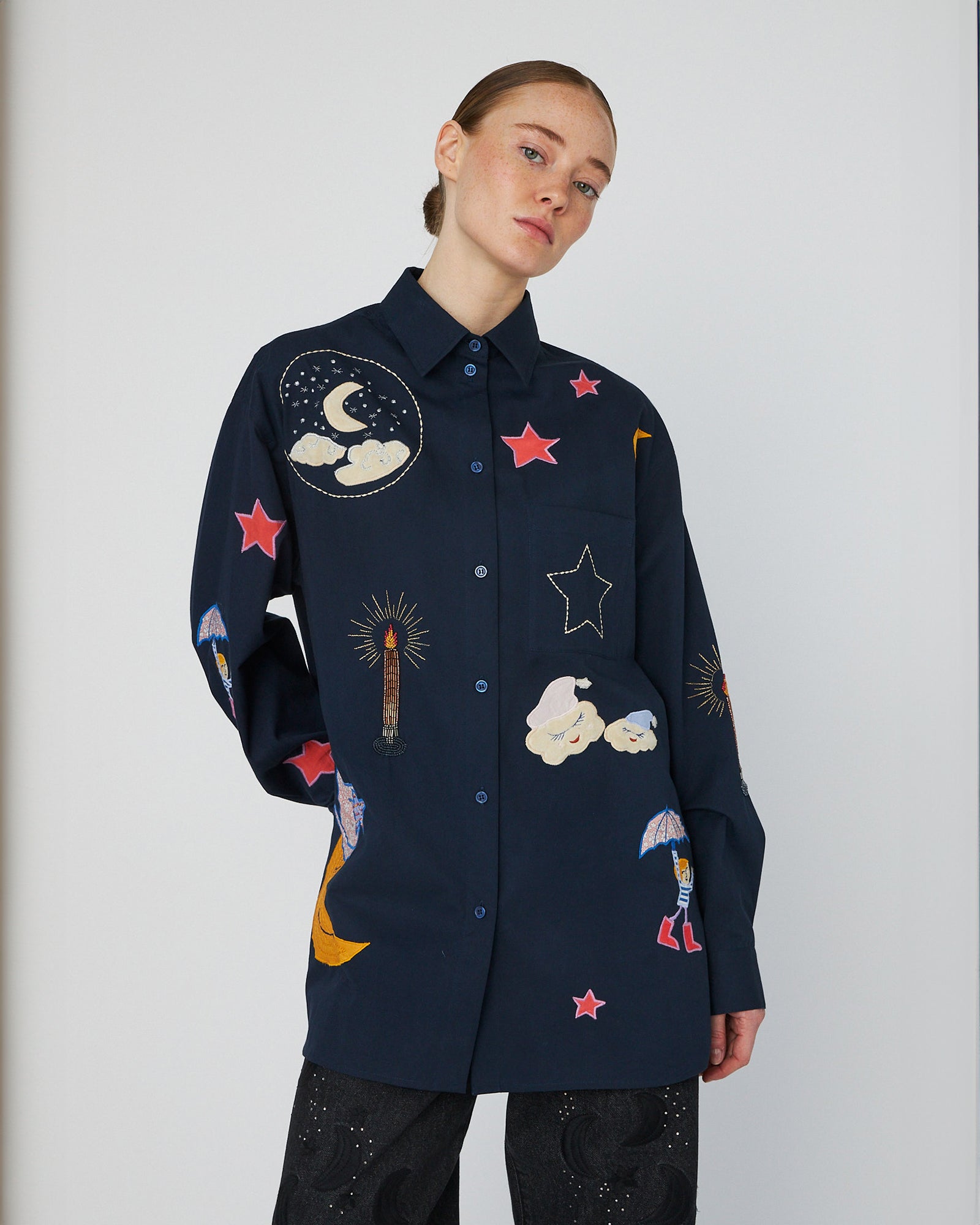 Flower Jacquard Loose Shirt - Navy
